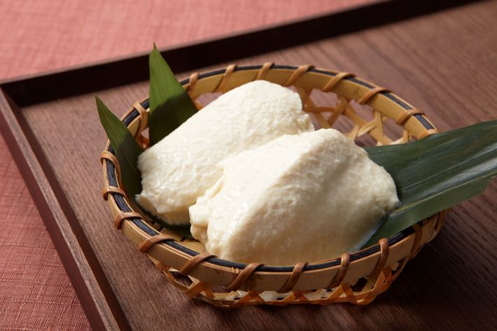 郷土食「ごどうふ」を使ったパフェ。「ごどうふ」の土台に、豆乳ソフトクリームと豆腐白玉が載っている