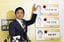 当確者のボードと撮影に応じる国民民主党の玉木代表=2024年10月27日午後8時49分、東京都新宿区