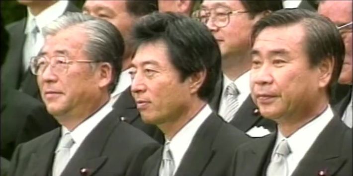 細川内閣発足時の記念撮影にて 左から山花貞夫政治改革担当相、細川護煕首相、羽田孜副総理兼外相(写真=防衛庁「