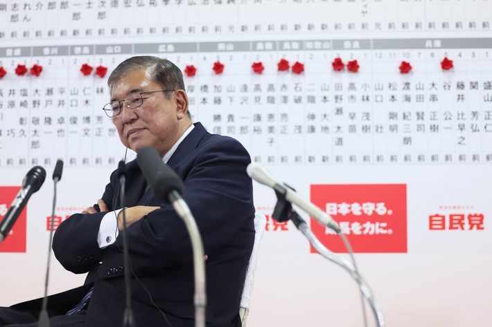 報道各社の取材で厳しい表情を見せる石破茂首相(自民党総裁)=2024年10月27日午後、東京・永田町の同党本部