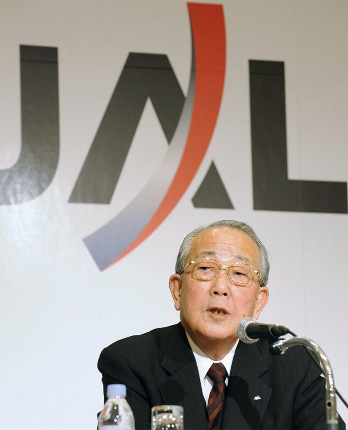 日本航空の会長に就任、記者会見する稲盛和夫氏=2010年2月1日午後、東京都内のホテル