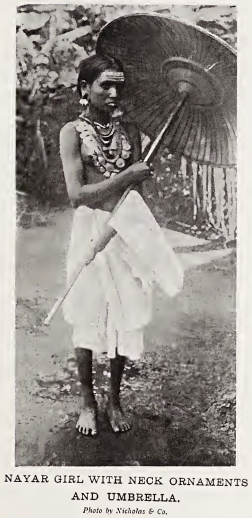 首飾りと傘を持った胸元を露出したナヤールの少女(写真=Somerset Playne Nicholas & Co./PD US expired/
