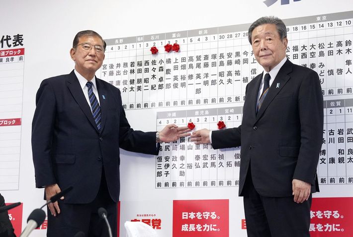 当選を決めた自民党の森山幹事長(右)の名前にバラを付ける総裁の石破首相=2024年10月27日、東京・永田町の党本部