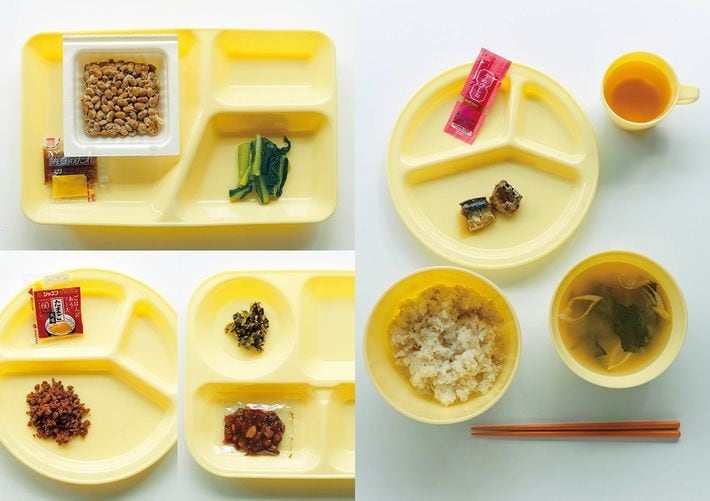 朝食メニューの再現例。(右から時計回りに)魚の缶詰など既製品を主としたおかず二品と味噌汁、麦飯、お茶が基本。高菜漬けと甘いピーナッツ味噌、卵風味ソースに鶏そぼろ、高菜漬けと納豆(写真=名和真紀子 料理=田内しょうこ)