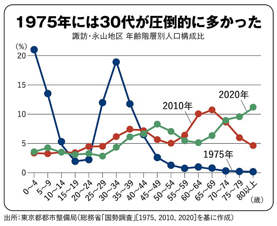 多摩ニュータウンの諏訪・永山地区の人口構成比の推移。1975年には、30代前後の大人と子どもの人口が圧倒的に多く、2020年では70歳以上が多いことがわかる。