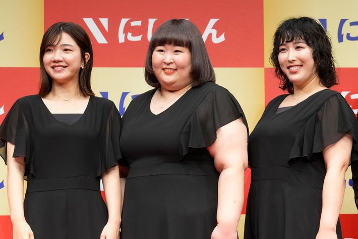 にしたんクリニック新CM発表会に登壇した「3時のヒロイン」の福田麻貴、かなで、ゆめっち(=東京都目黒区、2023年11月20日)