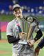 WBCの優勝トロフィーを手にする大谷=2023年3月22日(日本時間)、米マイアミ