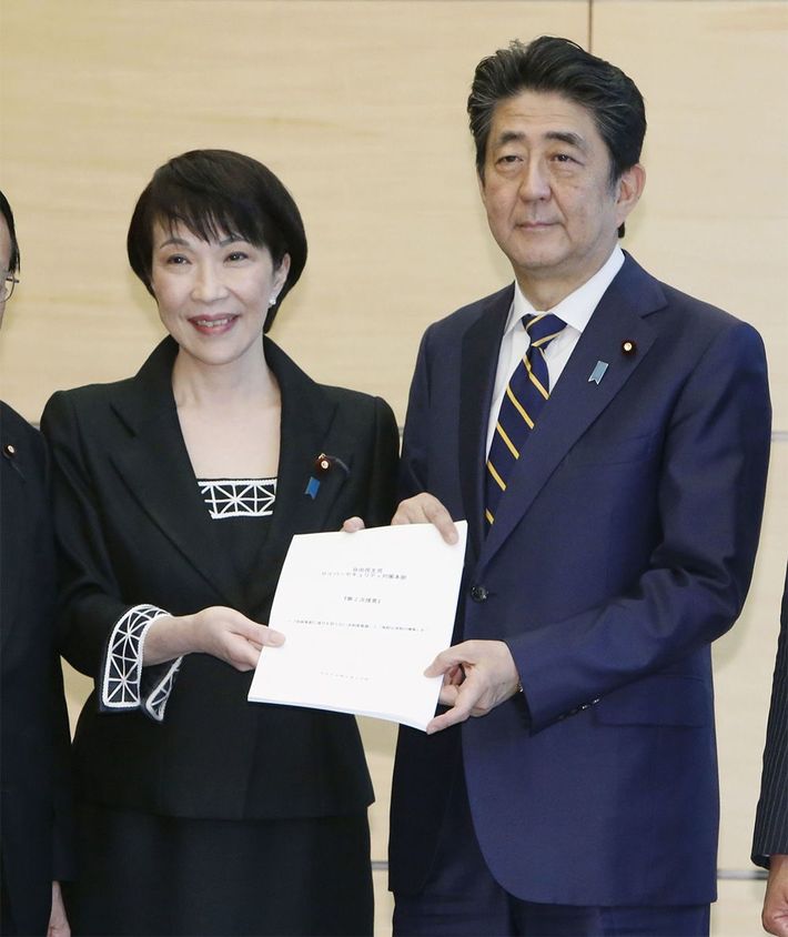 安倍首相(右)に提言書を手渡す自民党サイバーセキュリティ対策本部の高市早苗本部長=2019年5月14日午後、首相官邸