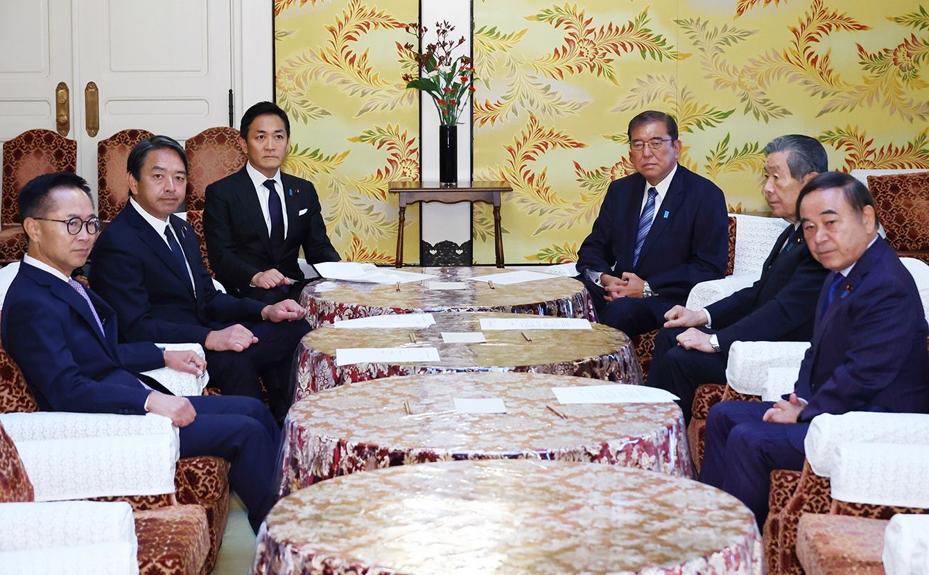 会談に臨む石破茂首相(中央右)と国民民主党の玉木雄一郎代表(同左)ら=2024年11月11日午前、国会内