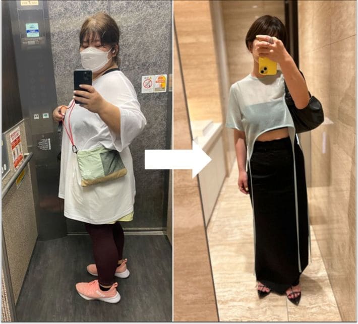 ダイエット前はオーバーサイズの服で体型を隠していたが、今はウエストインもできるように