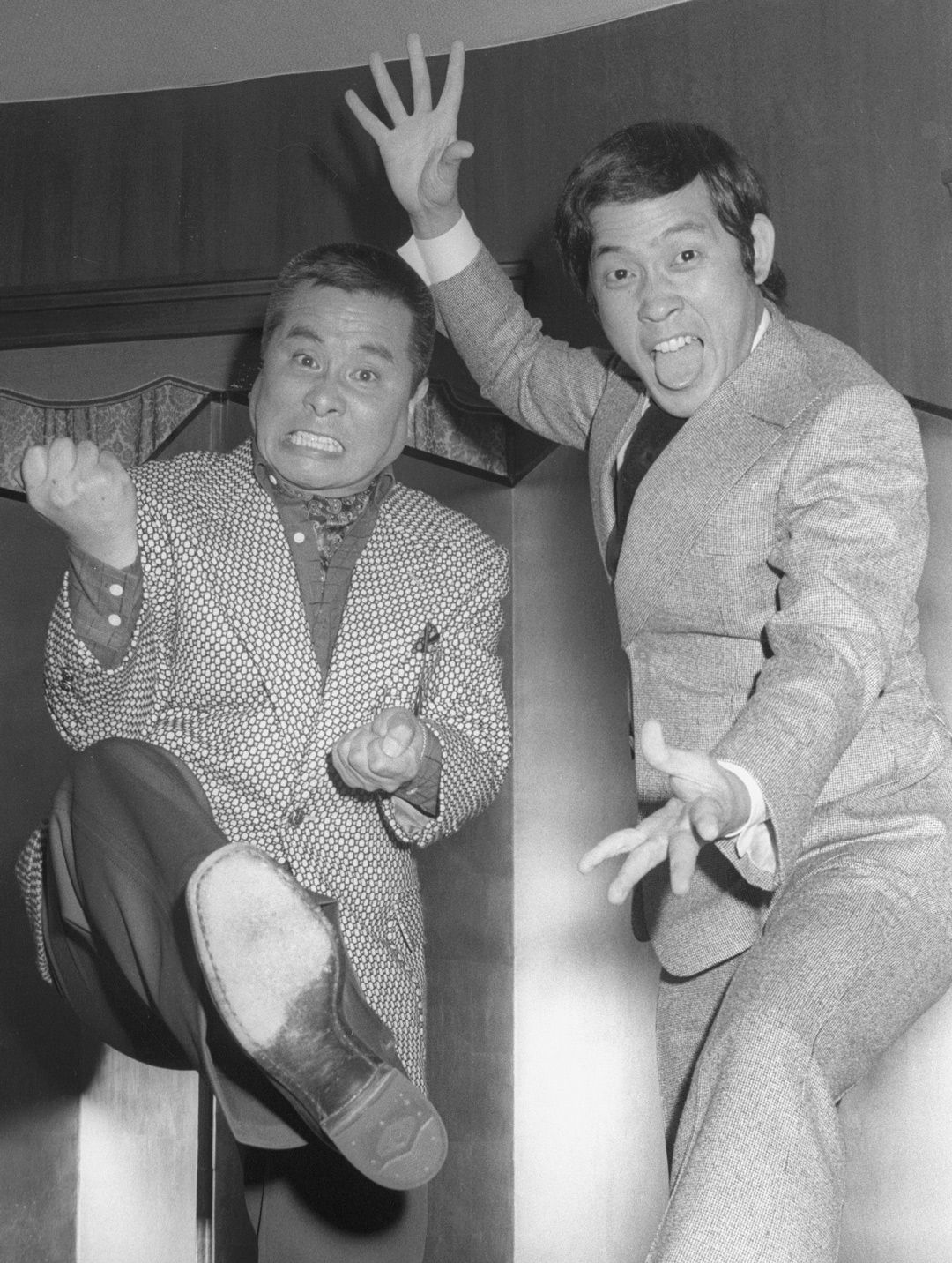 ポーズをとるコント55号の坂上二郎(左)と萩本欽一=1977年12月5日、東京都内のホテル