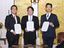 「103万円の壁」の引き上げなどで合意し、文書を持つ(左から)国民民主党浜口、自民党小野寺、公明党岡本の各政調会長=2024年11月20日午後、国会