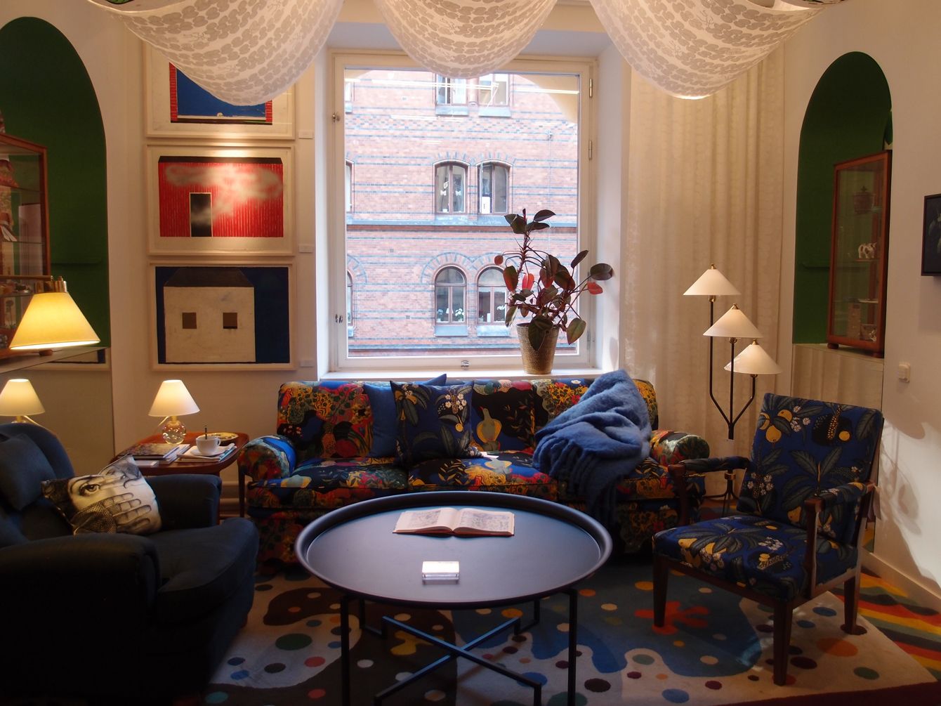 スヴェンスクト・テン本店にディスプレイされた「Noah’s Ark Nesting Table」(右)。同社の代名詞的デザイナーであるヨゼフ・フランクの写真とともに展示されていた。