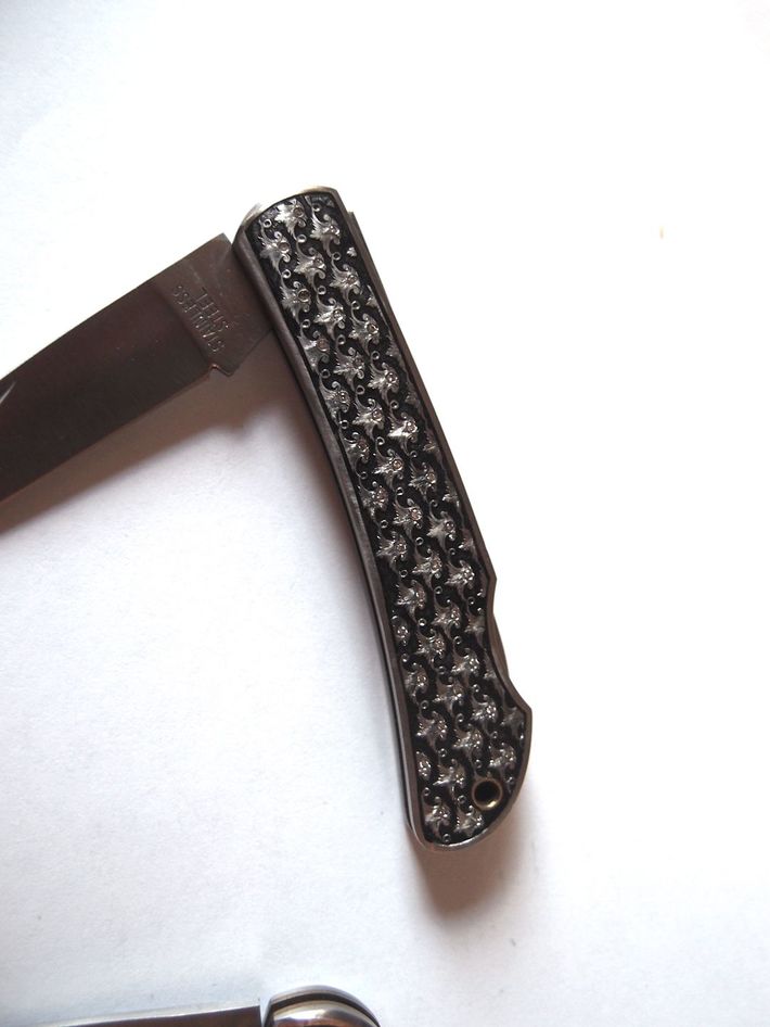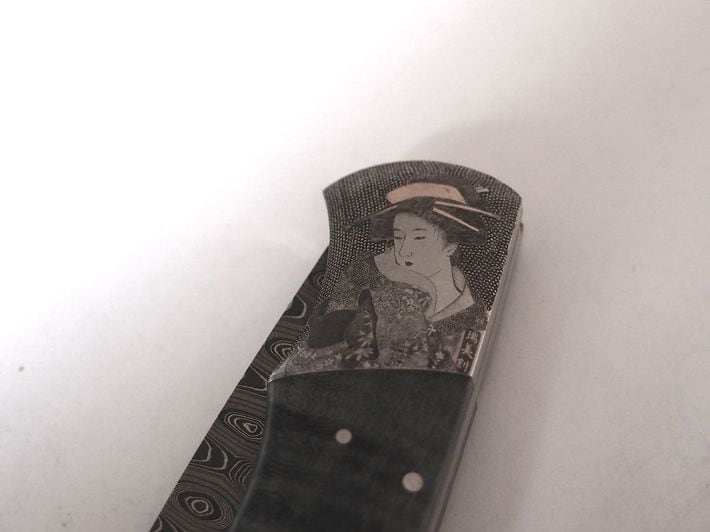 ヨーロッパの富裕層男性は、銃やナイフに豪華な模様を彫ることにお金を費やす。ハンティングナイフに施した、美知子さんの彫刻。