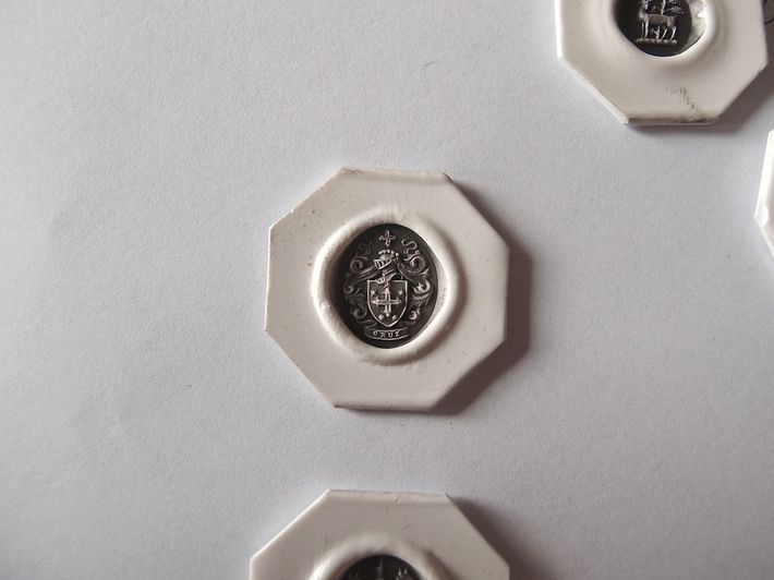 シグネットリング用の家紋プレート。完成した指輪は納品してしまうので美知子さんの手元には残らないが、家紋を反転して彫るためのプレートは残る。