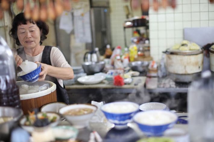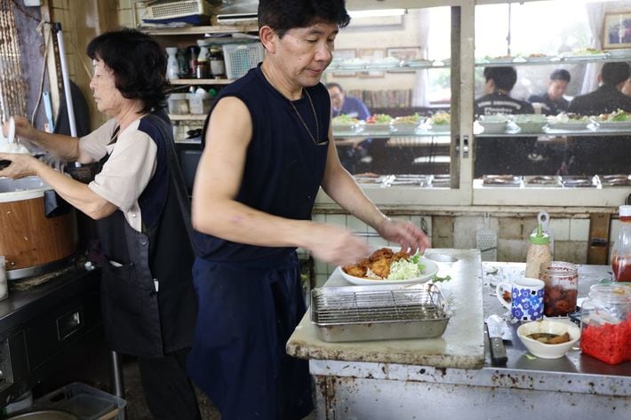 日光橋食堂の2代目店主・伊藤光利さん(奥)、妻の愛子さん(左)、勤続40年のパート職員・神田八重子さん