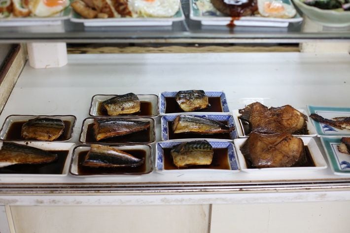 店内に並んだ「サバの煮つけ」。創業当初から常連客に人気が高い