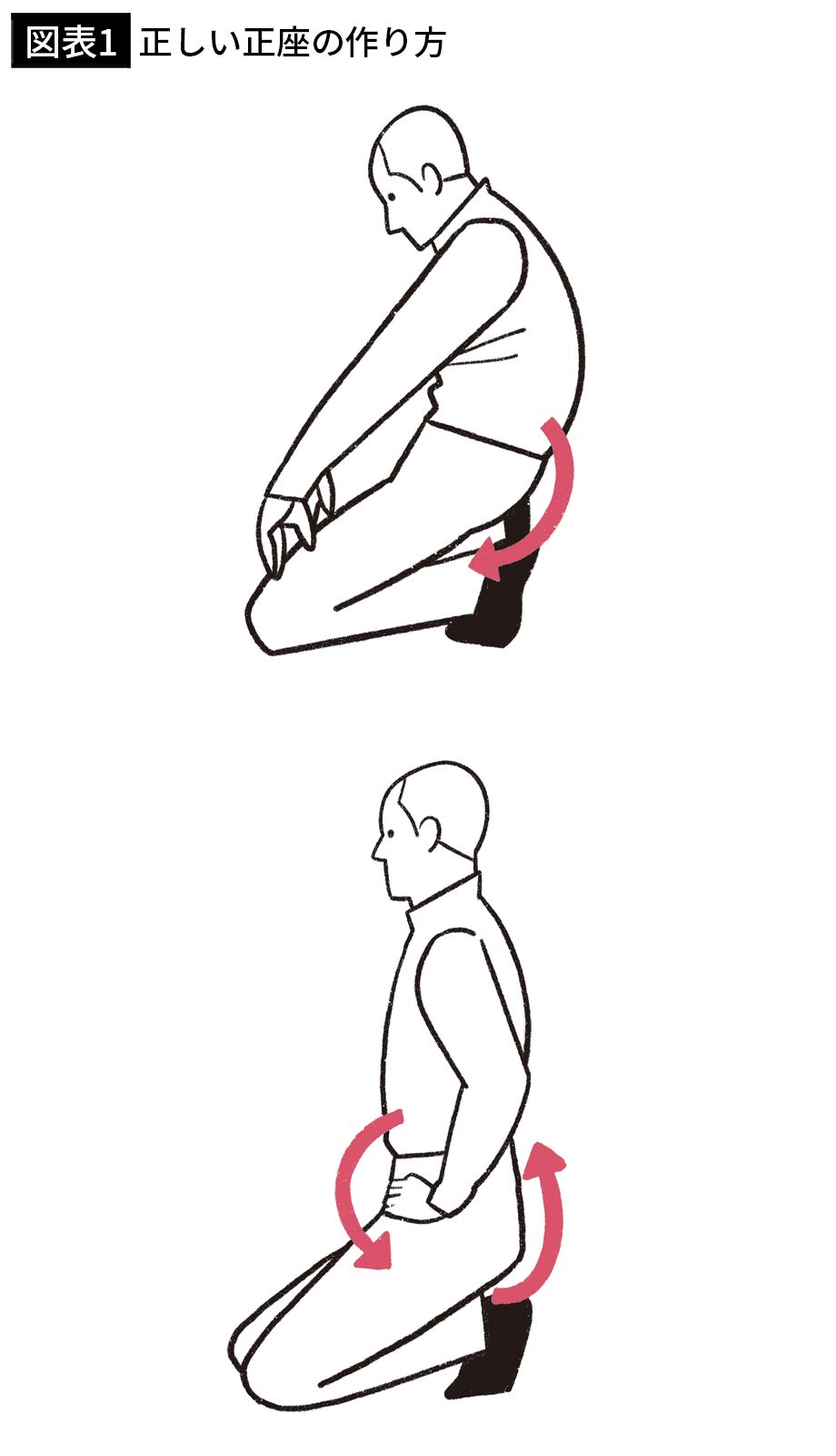 正しい正座の作り方。猫背の姿勢から、骨盤の動きを使って姿勢を整える(出所=『