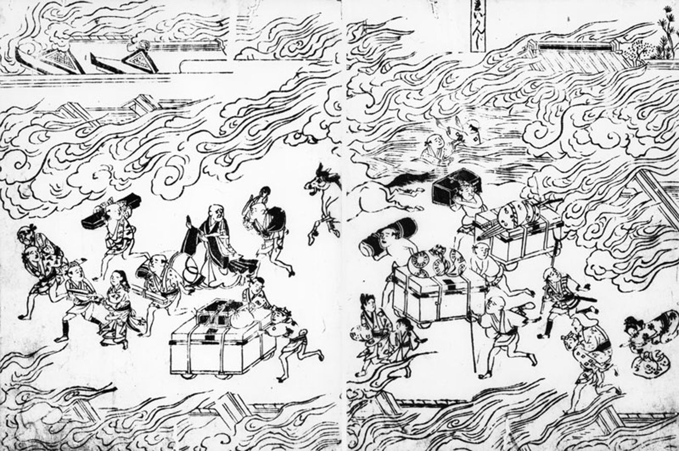 明暦の大火の際、たんすを荷台に乗せて迫り来る炎から逃れようとする江戸の人々(画像=Heineken, Ty & Kiyoko /CC-BY-SA-3.0/