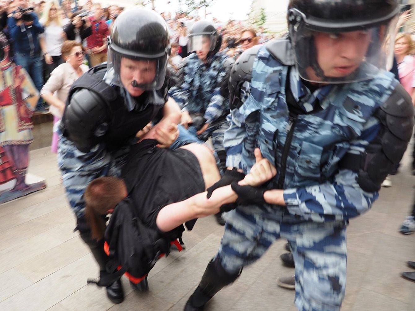 ナワリヌイ氏が呼びかけた反政権デモの参加者を取り押さえるロシアの特殊部隊=2017年6月12日、モスクワ