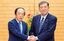 会談を前に握手する石破茂首相(右)と日銀の植田和男総裁。