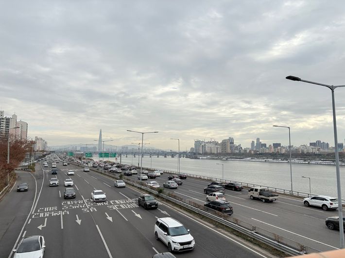戒厳令の4日前に撮影した、漢江のそばを通る幹線道路。戒厳令の直後には、国会周辺に集まった市民らで広い道路は大渋滞と化した