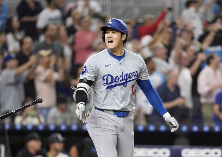 2024年9月19日、マーリンズ戦の7回に50号2ランを放ったドジャース・大谷。「50本塁打、50盗塁」を達成した=マイアミ(共同)