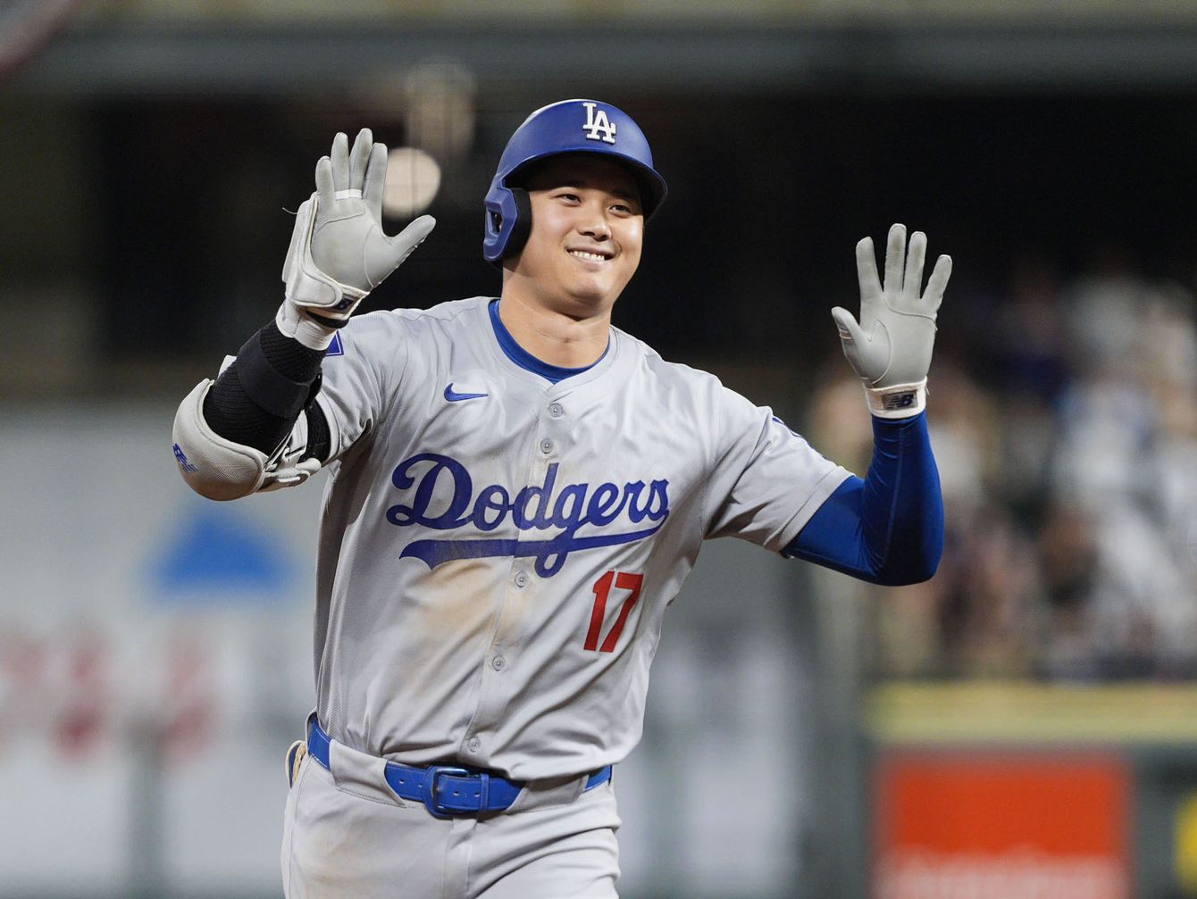 米大リーグ、ロッキーズ戦で54号3ランを放ったドジャース・大谷翔平。打点は130となった=2024年9月27日、デンバー(共同)