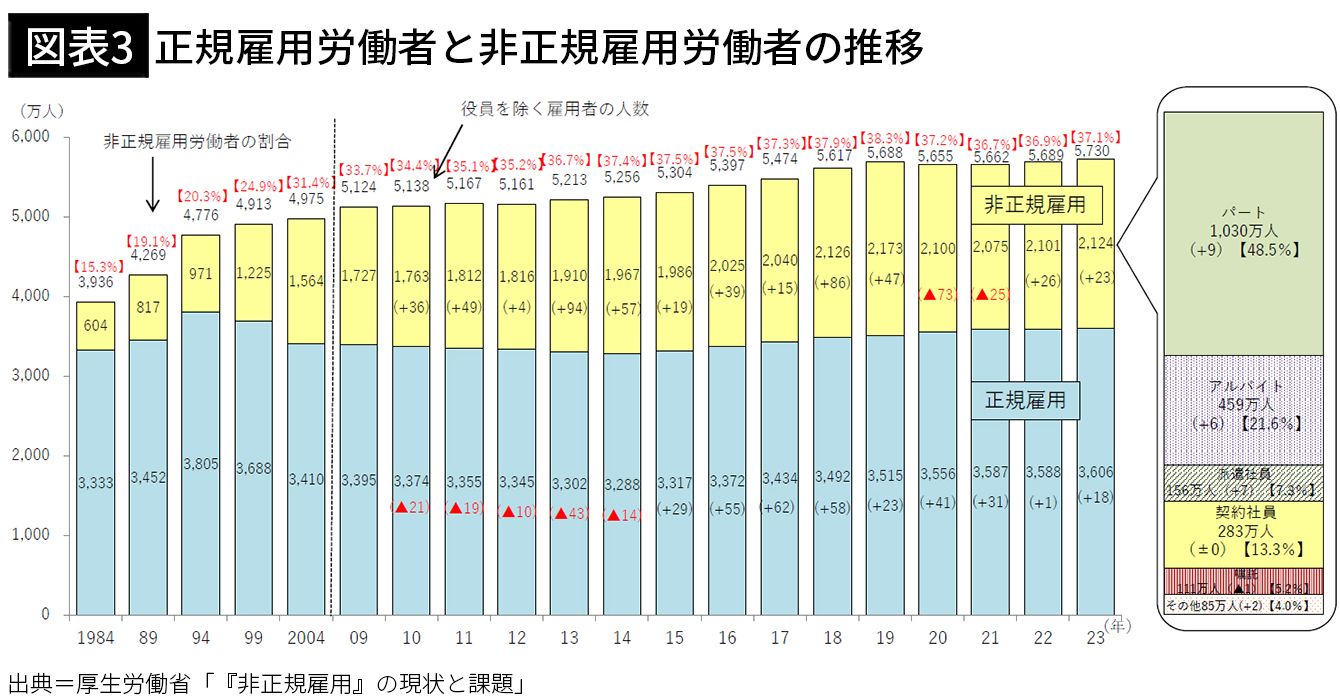 正規雇用労働者は2015年に8年ぶりにプラスに転じ、9年連続で増加。非正規雇用労働者は2010年以降増加が続き、2020年、2021年は減少したが、2022年以降は増加。