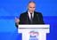 2024年12月14日、ロシア・モスクワのロシア・ナショナルセンターで開催された、与党「統一ロシア党」の第22回本会議で演説するプーチン大統領。