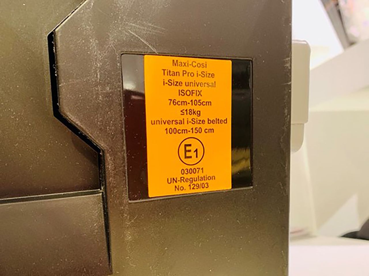 こちらが現行安全基準R129のEマーク。適応身長などが記載されている。