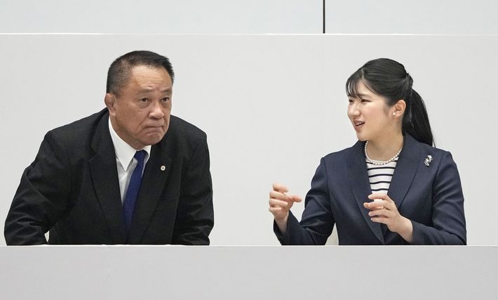 国民スポーツ大会の柔道競技を観戦中に全日本柔道連盟の西田孝宏副会長と話される愛子さま=2024年10月12日午前、佐賀市のSAGAアリーナ