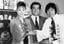 大みそか恒例のNHK「紅白歌合戦」の司会者に決まった女優の三田佳子さんと歌手の武田鉄矢さん。中央は総合司会のNHKの松平定知アナウンサー=1989年11月29日