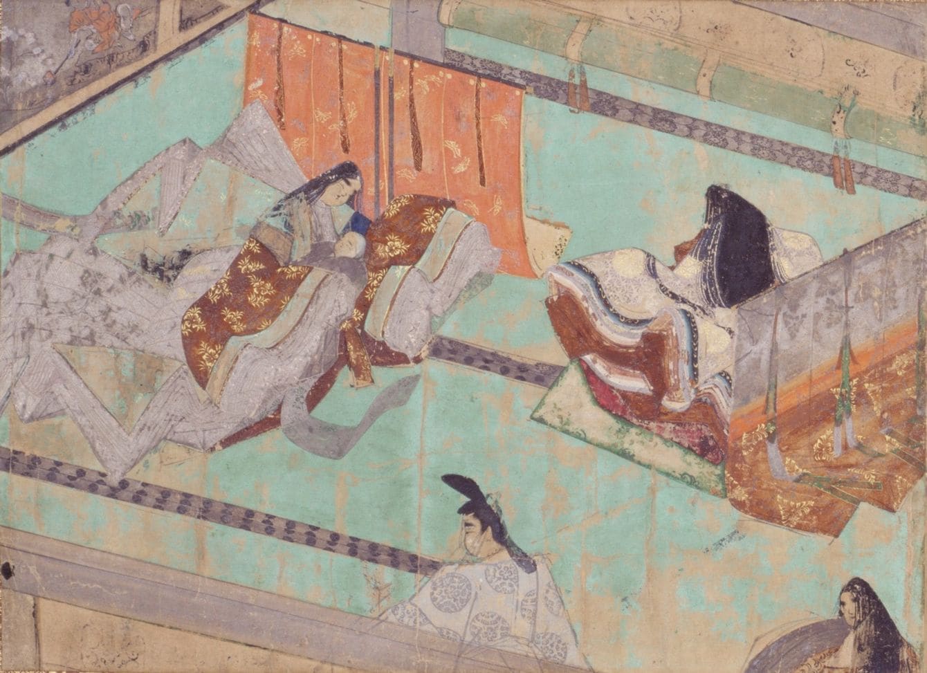 後一条天皇を出産したときの中宮彰子(右)とその母・倫子(左)、道長(画像=「紫式部日記絵巻断簡」/東京国立博物館蔵/CC-PD-Mark/