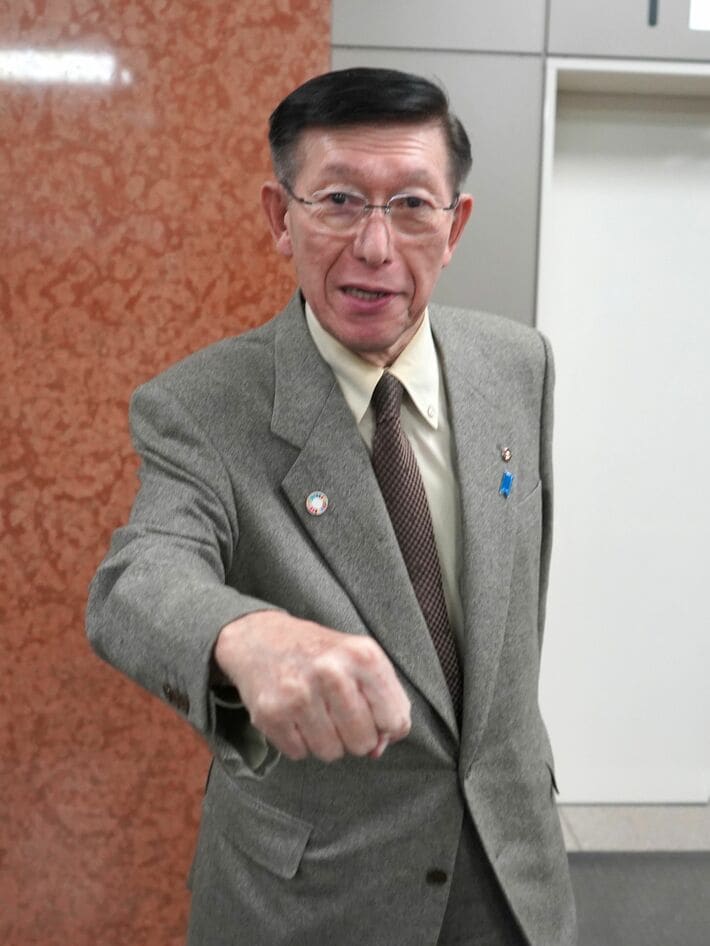 「ガチャン」と電話を切るポーズをする秋田県の佐竹敬久知事