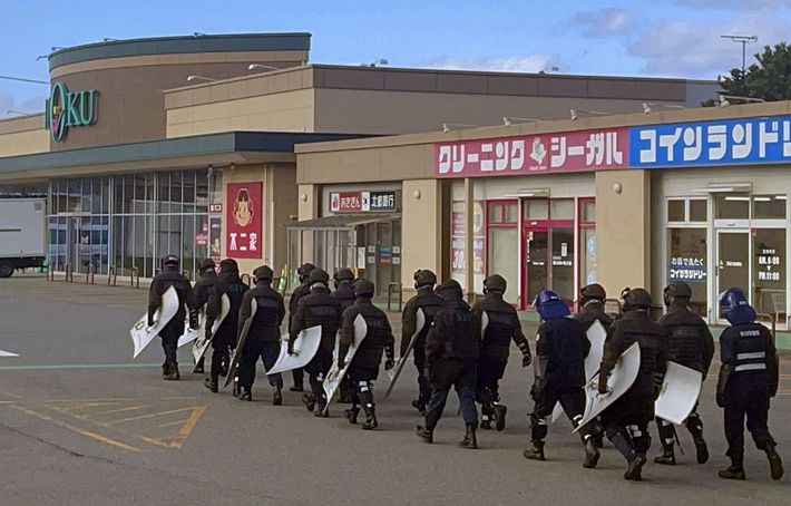 クマが入り込んだスーパー(奥)に向かう秋田臨港署員ら=2024年12月1日、秋田市