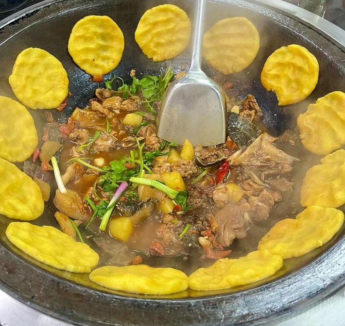 黄色いパンを鍋の周囲にぐるっと貼り付けたユニークな見た目の東北料理