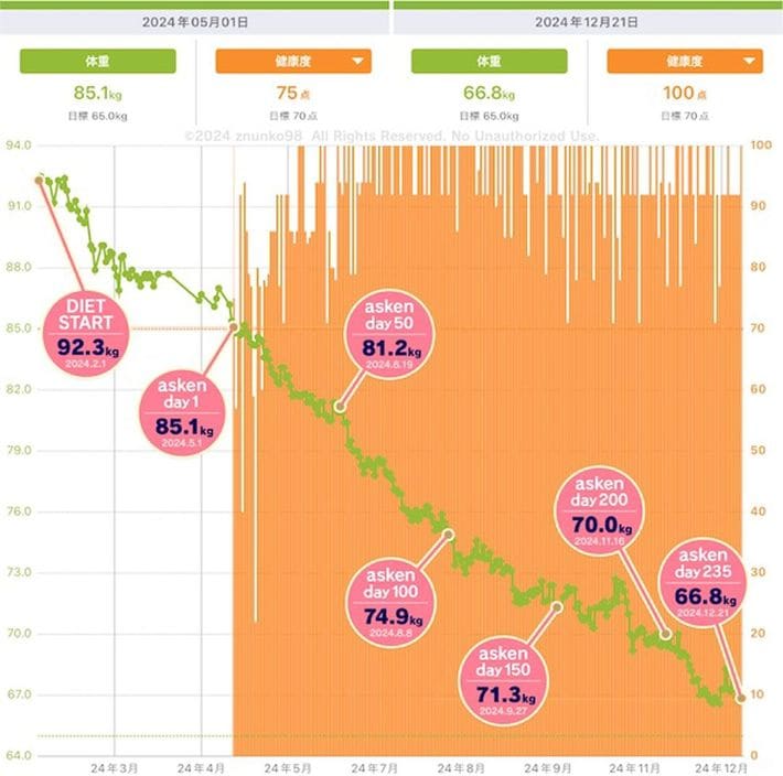あすけんでダイエット開始後の体重&健康度グラフ(画像提供=あすけん)