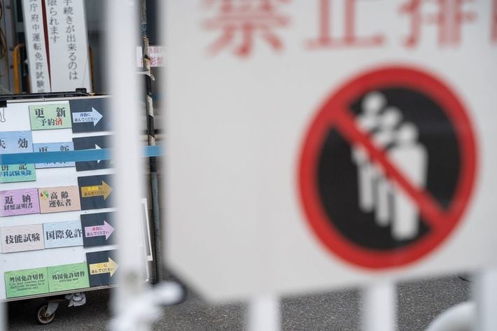 東京の府中運転免許試験場に行列を作る外国人ら