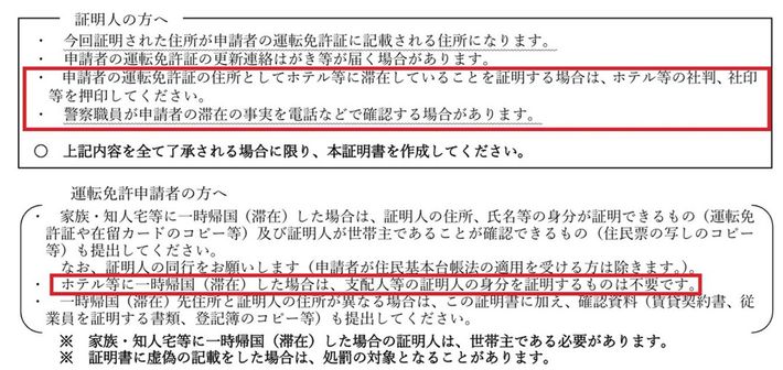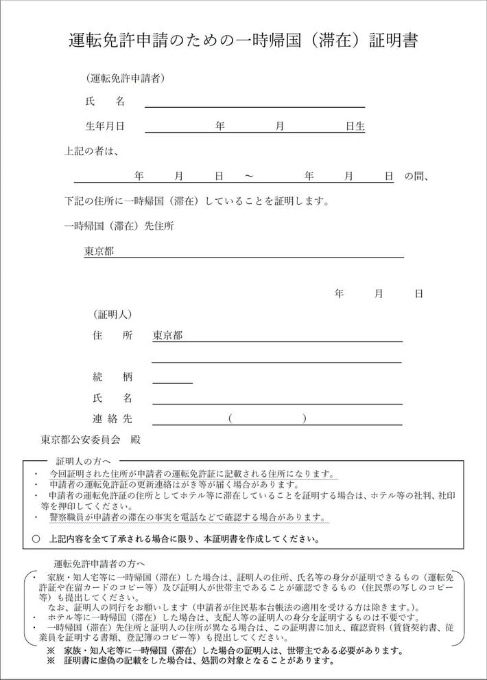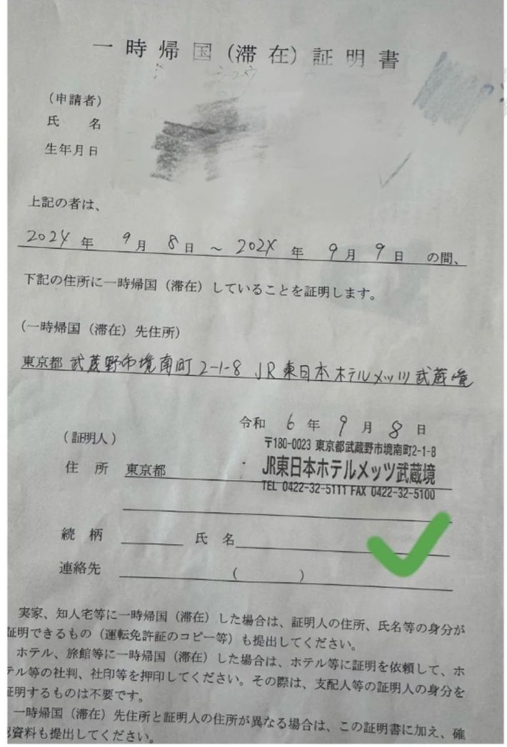 証明人を都内のホテルとする一時帰国(滞在)証明書