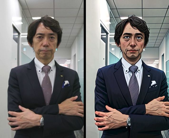 出典=カンテレ「八雲とセツの怪談事件簿」トレーラーより。生成AIアニメの1コマ。大多亮新社長の実写(左)実写を基に生成AIで作られたキャラクター(右)