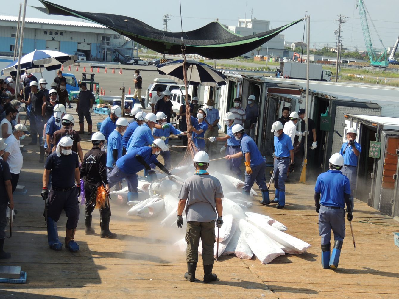 静岡県の焼津港で陸揚げされる冷凍マグロ