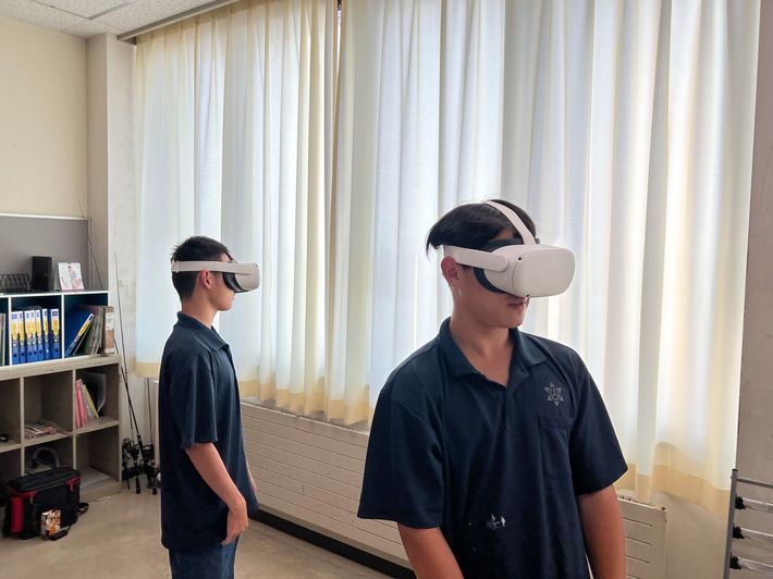 VRゴーグルで遠洋マグロ漁を疑似体験する山形県立加茂水産高校の生徒ら(2024年8月撮影)