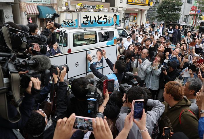 2024年10月末、兵庫県知事選で、支持者らに囲まれながら自身のポスターを貼る斎藤元彦候補者(当時)。