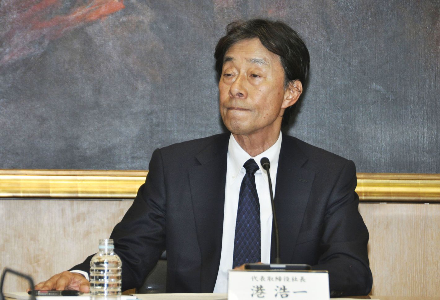 記者会見するフジテレビの港浩一社長=17日午後、東京都港区のフジテレビ