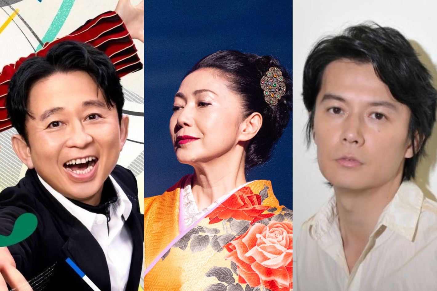 (左から)総合司会の有吉弘行、今回の出場歌手で最多出場(47回)の石川さゆり、5年連続で白組トリを務めた福山雅治(『NHK紅白歌合戦』公式Xより/©文藝春秋)