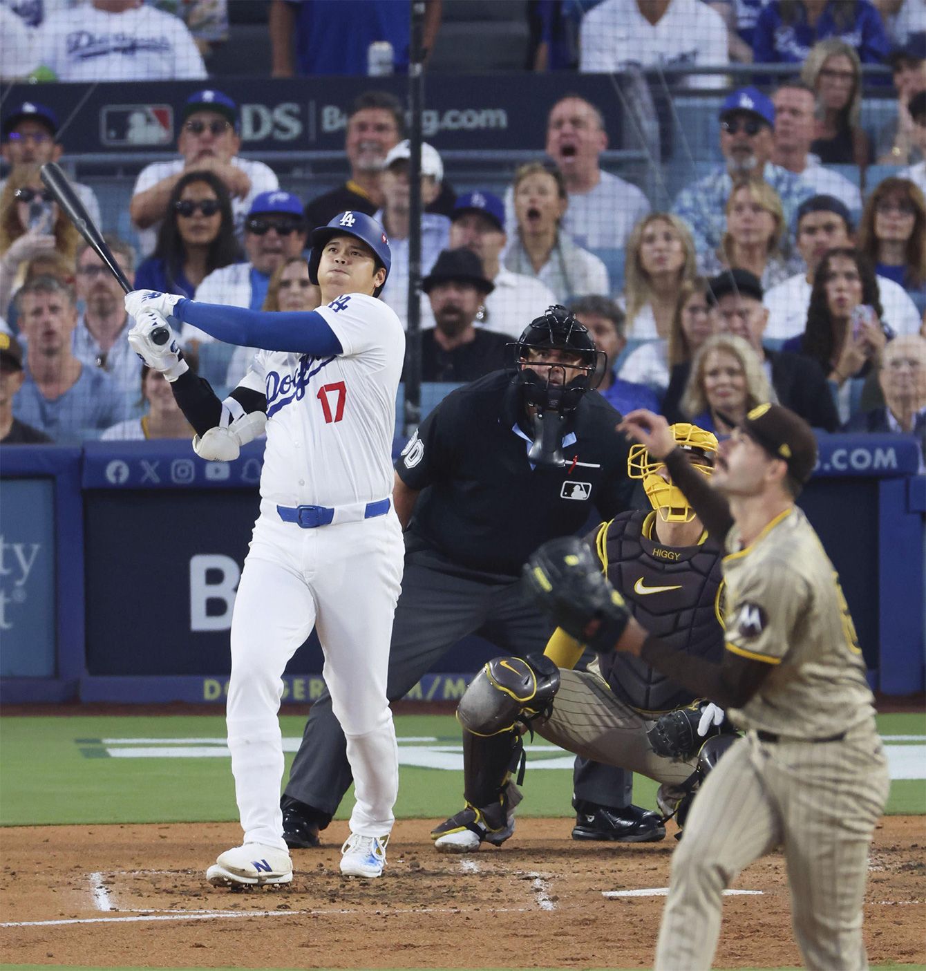 2024年10月5日、パドレスとの地区シリーズ第1戦の2回、同点3ランを放つドジャース・大谷。投手シース=ロサンゼルス
