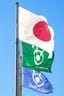 フジ・メディア・ホールディングス(HD)の本社に掲げられた(手前上から)日本国旗、フジ・メディアHDの旗、フジテレビの社旗=2025年1月17日、東京都港区