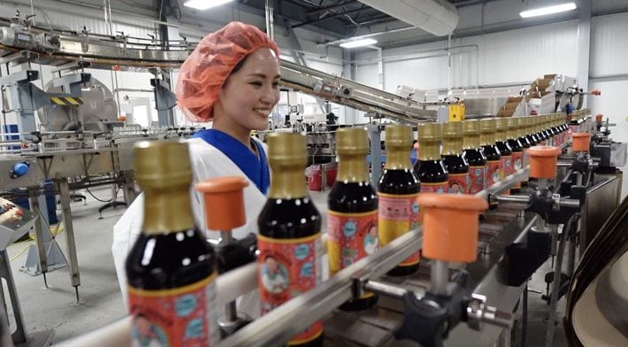 2024年6月、アメリカ、バージニア州のSAN-Jの工場でウマミソースの製造工程を確認するモエさん。YouTubeチャンネル Kimono Mom「