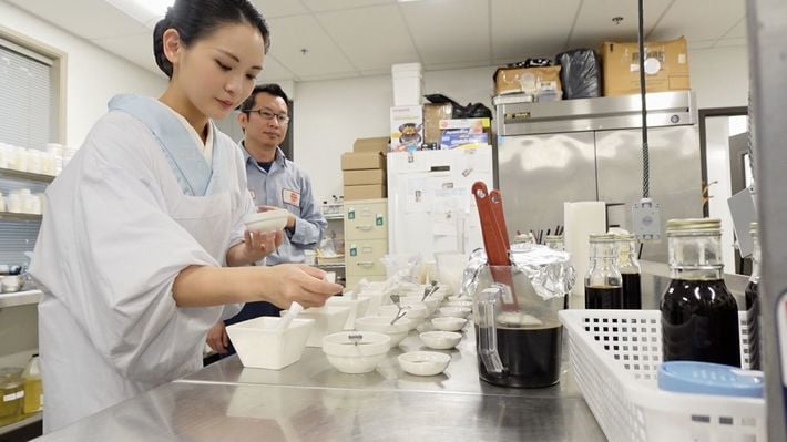 2024年1月、アメリカ、バージニア州のSAN-Jの工場でウマミソースの開発をするモエさん。